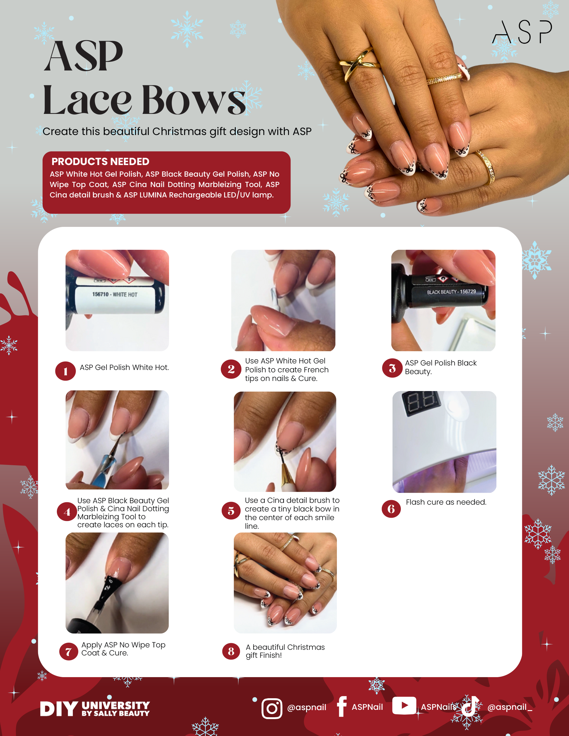 ✨ Step 1: Classic French Base Apply ASP White Hot Gel Polish to prepped nails. Create clean French tips on each nail and cure under the ASP LUMINA Rechargeable LED/UV Lamp.