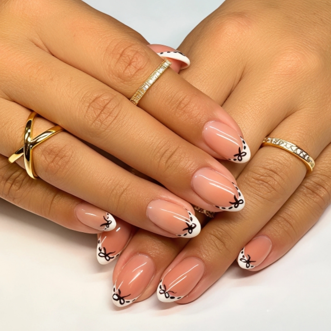 ✨ Step 3: Bow Accent With a Cina detail brush, paint a tiny black bow at the center of each smile line using ASP Black Beauty Gel Polish. Flash cure once complete.