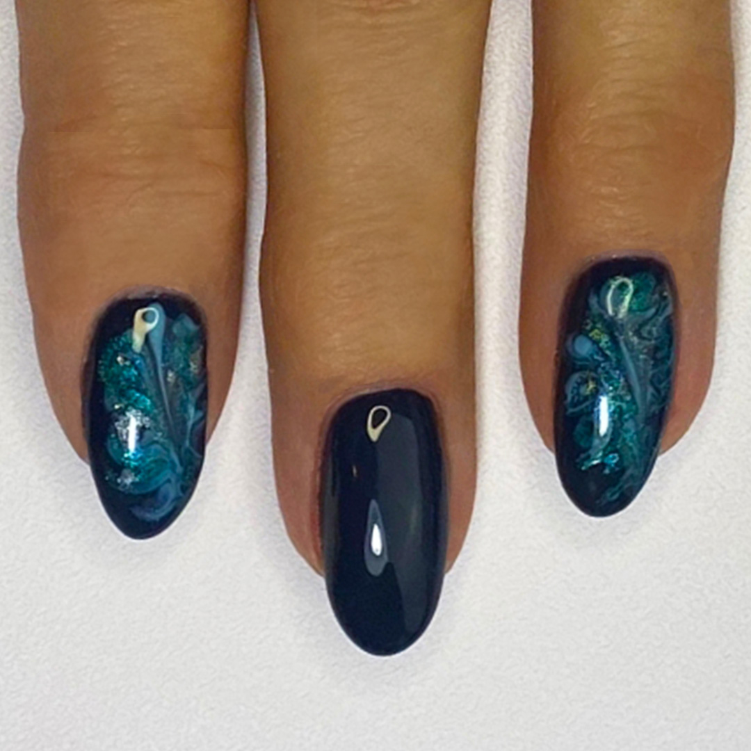 Paint on Deep Blue Sea Gel Polish, curing between coats, then grab your fave colors—On Vacation Time, Meadowbrook, Keep Dreaming, and Emerald Bay. Dot and swirl with the Cina Marbleizing Tool for that chic marble moment.