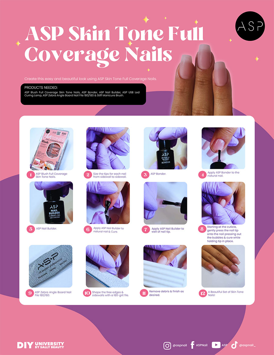 Start by selecting ASP Blush Full Coverage Skin Tone Nails and size each tip to fit from sidewall to sidewall for a perfect, natural look.