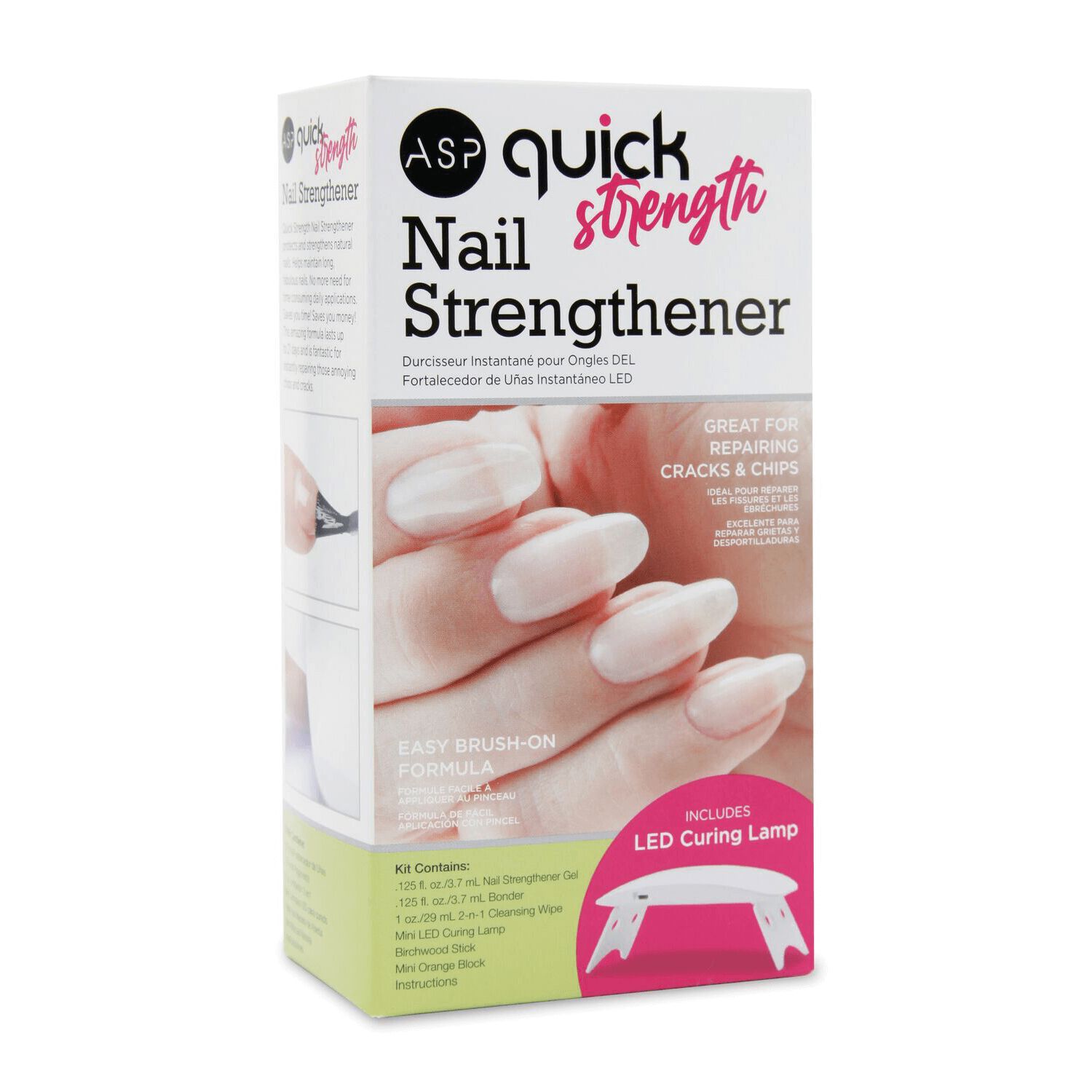 ASP Quick Strength LED Nail Strengthener gives your nails instant strength; 30 seconds under LED/ 2 minutes in UV light. Lasts up to 21 days. Kits contains: .125 fl oz Nail Strengthening Gel, .125 fl oz Bonder, 1 fl oz 2 n 1 Cleansing Wipe, Mini LED Curing Lamp, Birchwood Stick, Mini Orange Block & Instructions.